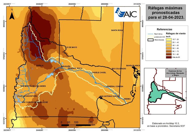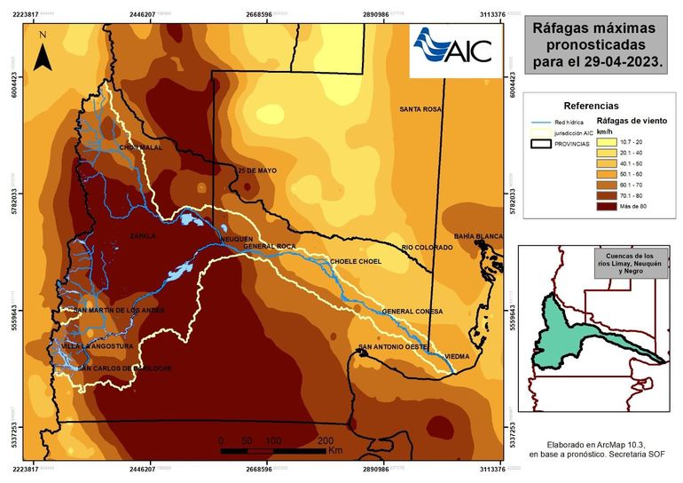 "Valles: Mañana viernes y sábado vientos moderados a fuertes (+70 Km/h). Aire frío ingresa en la región, descenso de la temperatura a partir del domingo. Noches frías, heladas matinales a partir del lunes 1/5.Meseta centro norte de Neuquén: Viernes y sábado, inestable con probables lluvias. Vientos fuertes con ráfagas intensas (+80 km/h). Descenso de la temperatura. Frío a partir sábado, heladas nocturnas", concluye la misiva.