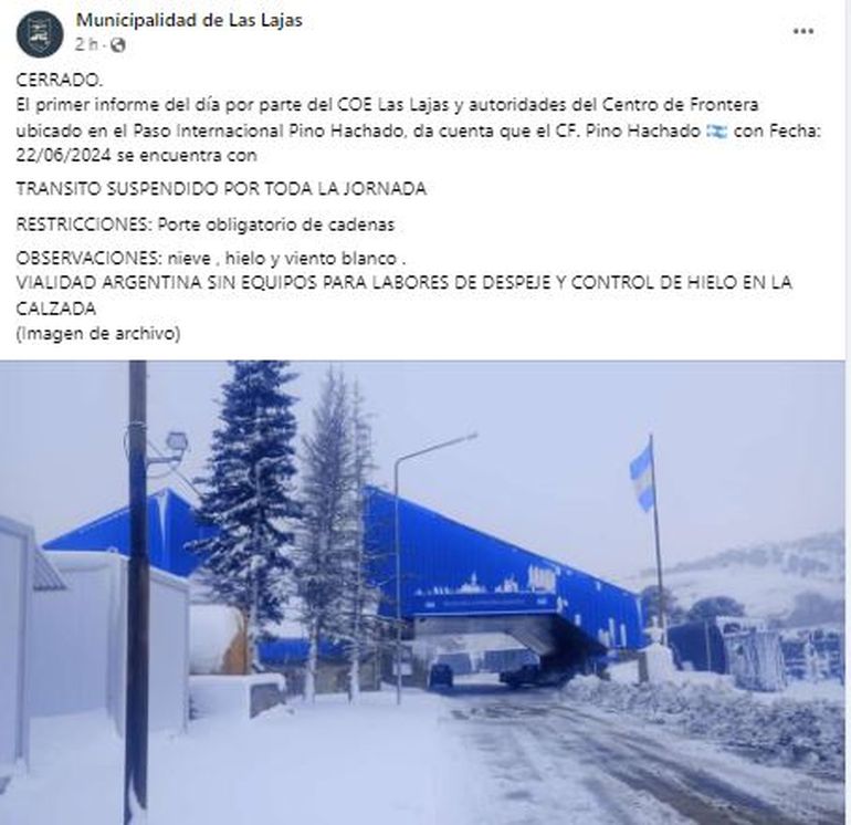 El principal obstáculo es la acumulación de nieve, hielo y viento blanco que se registra en esta zona. Por esta razón, desde Vialidad Provincial informaron que el Paso Fronterizo Pino Hachado permanecerá cerrado durante toda la jornada. Hay equipos trabajando para despejar la calzada, pero la visibilidad es nula y hay bastante hielo adherido que hace peligrar el tránsito de cualquier tipo de vehículo.