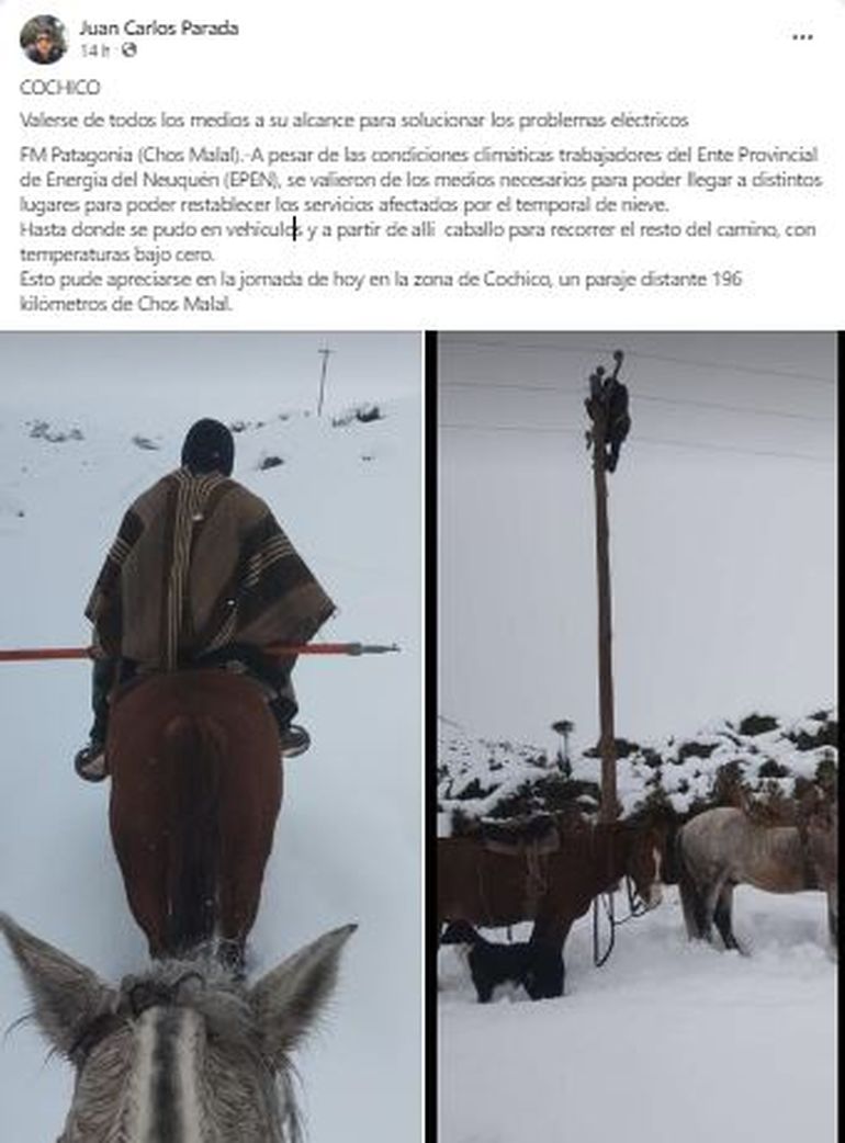 Por el fuerte temporal, varias localidades y parajes del norte neuquino quedaron sin energía eléctrica como consecuencia de la caída de vario postes y árboles. Sin embargo, personal del EPEN realizó una titánica tarea para reestablecer el servicio que en los sectores más críticos se había interrumpido el jueves. Donde no pudo llegar con las máquinas y vehículos, llegó a caballo, como ocurrió en la zona de Cochico, un paraje distante 196 kilómetros de Chos Malal. Allí se valieron de los medios que tenían para lograrlo y las imágenes son impactantes.