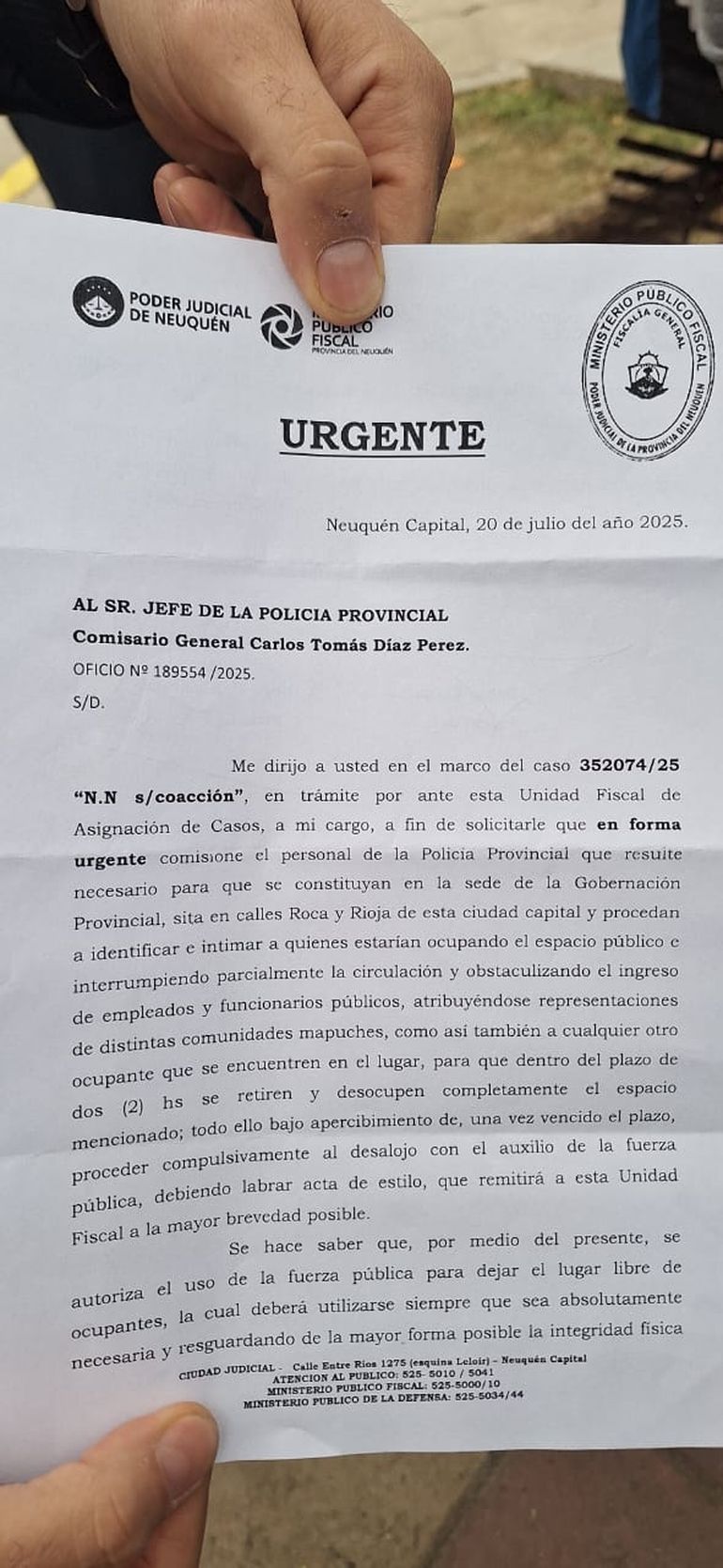 A raíz de esta escalada de denuncias llegó la notificación, reglamentada por Fiscalía, que indica "en forma urgente" el desalojo, sumado a la identificación e intimación de quienes ocupan este espacio de las calles Roca y Rioja, que impide la circulación y obstaculiza el ingreso de empleados y funcionarios públicos a la Casa de Gobierno. A su vez, se establece que en el plazo de dos horas se deberá realizar la desocupación del lugar.