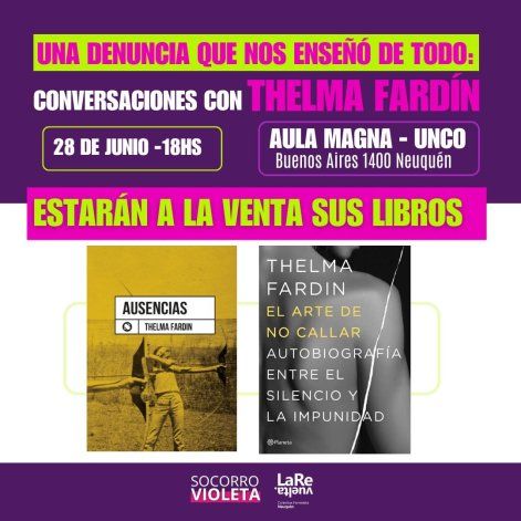 Fardín llegará a la ciudad para brindar una charla en el Aula Magna de la Universidad Nacional del Comahue (UNCo), ubicada en Buenos Aires 1400 de Neuquén Capital a las 18. La actriz fue invitada por las integrantes de la Colectiva Feminista La Revuelta y Socorro Violeta quienes organizaron la charla abierta bajo el título "Una denuncia que nos enseñó de todo: conversaciones con Thelma Fardín".