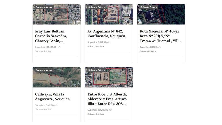 En la ciudad de Neuquén, se anunció la futura subasta de otros dos inmuebles además de la ex U9, ubicada en Santa Genoveva. Se publicó otro predio de 100 mil metros cuadrados en barrio Confluencia, entre las calles Luis Beltrán, Saavedra, Chaco y Lanín, y otra esquina ubicada en Islas Malvinas y Buenos Aires, de 3,500 metros cuadrados, donde hoy funciona un estacionamiento y lavadero de autos.