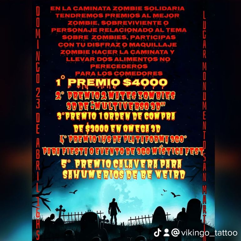 Se trata de la primera caminata solidaria de zombis al estilo "Walking Dead" que se desarrollará en esta ciudad, este domingo. La convocatoria será en el monumento San Martín, a las 16. En un principio, querían llegar caminando hasta el Paseo de la Costa. Pero como el evento está pensado para que participe toda la familia, incluido los niños y niñas, el trayecto culminará en el cenotafio a los Caídos de Malvinas, ubicado en la calle Chubut 105.