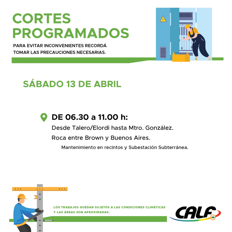 En todos los casos, CALF recomienda que los usuarios tomen los recaudos necesarios para evitar inconvenientes y que las zonas mencionadas son aproximadas. A su vez, los trabajos a realizar quedan sujetos a las condiciones climáticas que puedan impedir las actividades de los operarios.