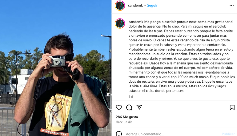 “... me siento desmembrada, ahuecada por algunas zonas de mi cuerpo, mi compañero de vida, mi hermanito con el que todas las mañanas nos levantábamos a tomar una choco y a ver el top 100 de Much Music. El que ponía los dvds de recitales en vivo una y otra y otra vez. El que le encantaba la vida al aire libre. Estás en la música, estás en los ríos y lagos, estas en el cielo, donde perteneces”, lo recordó Candela.