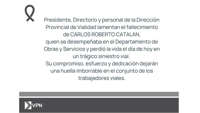Desde Vialidad Provincial manifestaron su dolor por el fallecimiento de Catalán, quien se desempeñó en el Departamento de Obras y Servicios. "Su compromiso, esfuerzo y dedicación dejarán una huella imborrable en el conjunto de los trabajadores viales", señalaron las máximas autoridades y personal en general del organismo provincial.