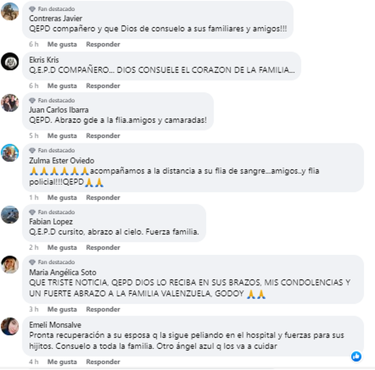 "La Policía del Neuquén acompaña en este difícil momento, ante el fallecimiento de quien en vida fuera el sargento Jonatan Ernesto Godoy con servicio en la División Tránsito Neuquén, hermano del subcomisario Juan Marcelo Valenzuela, con servicio en la Comisaría 5° de Centenario. Acompañamos a nuestro camarada, familiares y amigos, ante tan irreparable pérdida, elevando una plegaria para que encuentre la fortaleza que le permita sobreponerse a tanto dolor y congoja", comunicaron.