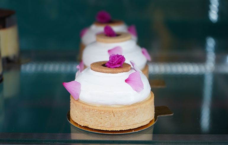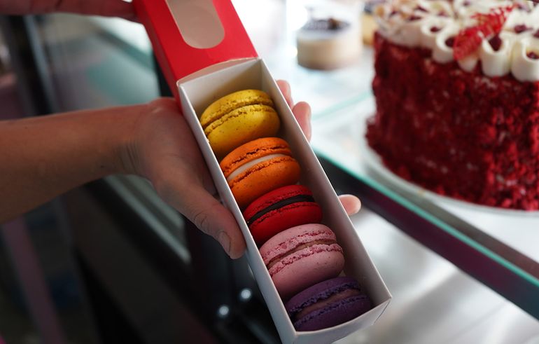 Coloridos marcarrons de arándanos, chocolate amargo, maracuyá, frutilla, y durazno y mango. Los clásicos brownies, cramble de manzana y cuadrados de limón y arándanos. El imperdible budín de banana con avena y chocolate blanco; o el sablé de pistacho, ganache de limón y un corazón de frutos rojos.