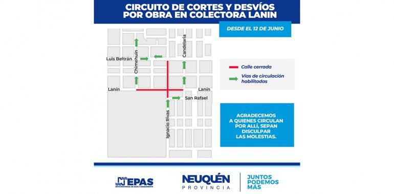 Los vehículos que circulan de Este a Oeste por calle Lanín deberán desviarse en calle Chimehuín; en cambio los que vengan en sentido Oeste a Este, tendrán que hacerlo por la calle Candelaria.