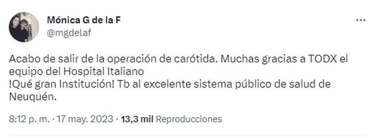 “Acaba de salir de la operación de carótida. Muchas gracias a TODX el equipo del Hospital Italiano. ¡Qué gran Institución! También al excelente sistema público de salud de Neuquén”, escribió en Twitter y agregó: “Gracias Dios por escuchar los rezos. Nace una flor, todos los días sale el sol. ¿Dónde vamos corazón? A seguir...siempre”.