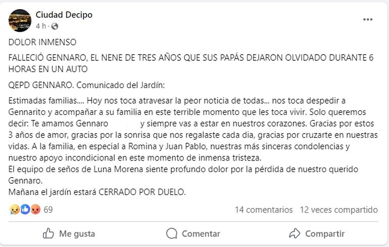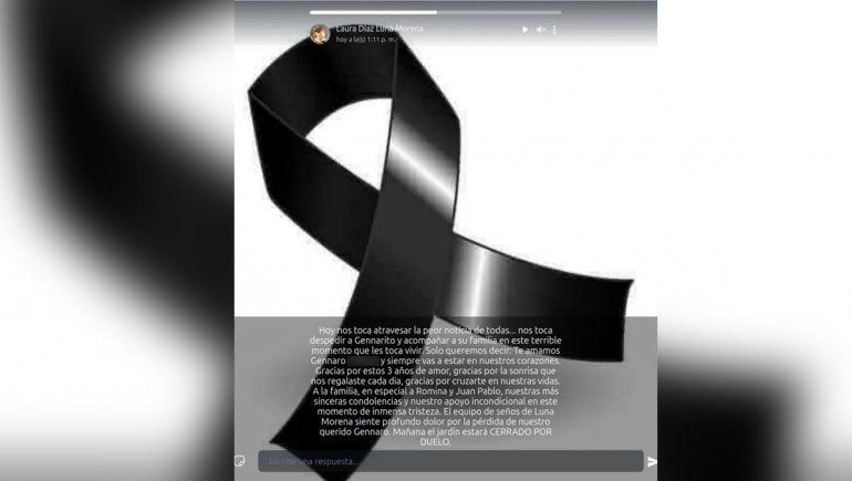 "Hoy nos toca atravesar la peor noticia de todas...Nos toca despedir a Gennarito y acompañar a su familia en este terrible momento que les toca vivir. Solo queremos decir: Te amamos Gennaro y siempre vas a estar en nuestros corazones. Gracias por estos tres años de amor, gracias por la sonrisa que nos regalaste cada día, gracias por cruzarte en nuestras vidas. A la familia, en especial a Romina y Juan Pablo, nuestras más sinceras condolencias y nuestro apoyo incondicional en este momento de inmensa tristeza. El equipo de seños del (jardín maternal) Luna Morena siente profundo dolor por la pérdida de nuestro querido Gennaro", reza el posteo que compartieron este mediodía en sus estados de Whatsapp.