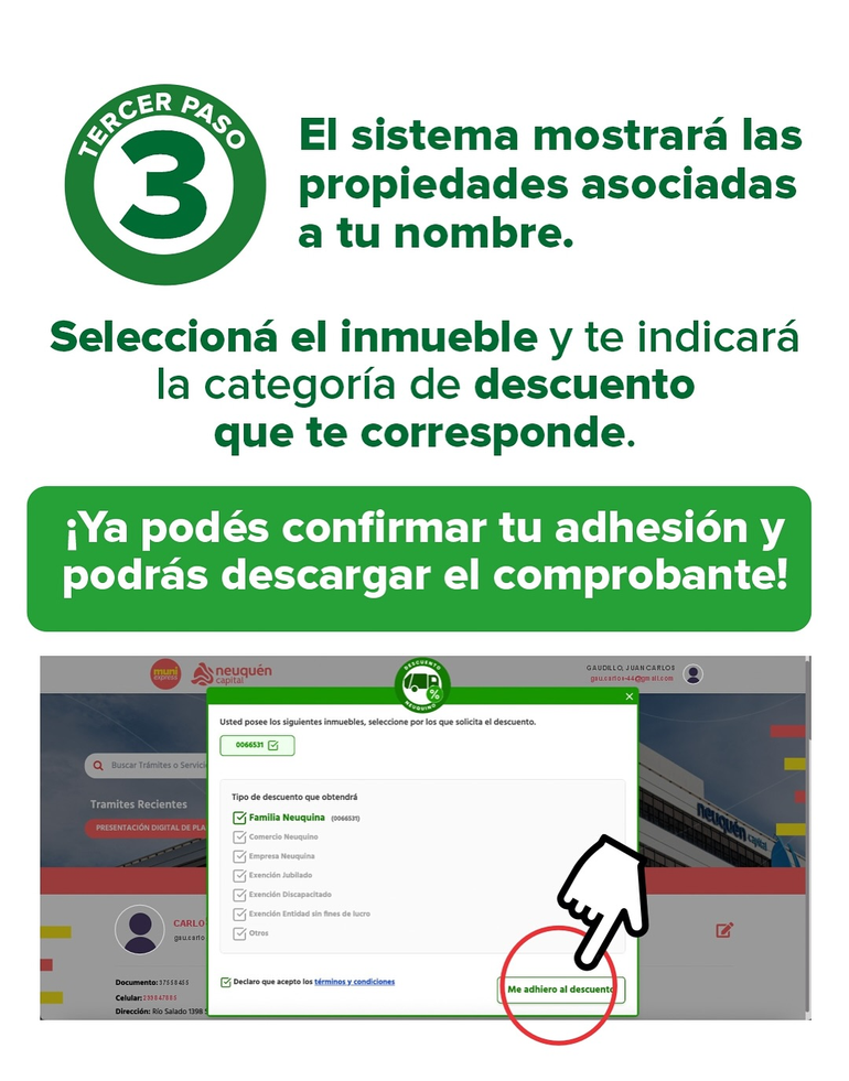 Al presionar cada inmueble, el sistema informa el descuento que se aplicará a partir del primero de enero según la condición del titular: