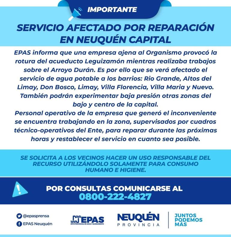 Los barrios que ven afectado el servicio de agua potable son: Río Grande, Altos del Limay, Don Bosco, Villa Florencia, Villa María y Barrio Nuevo. También podrán experimentar baja presión otras zonas del bajo y centro de la capital.