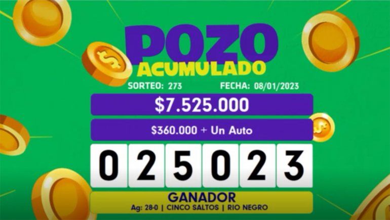 Según informaron oficialmente desde el Gobierno de Río Negro, el número del cupón ganador fue el 25023 y el cartón fue vendido por la Agencia N° 28 de Cinco Saltos, ubicada en calle San Martín 936.