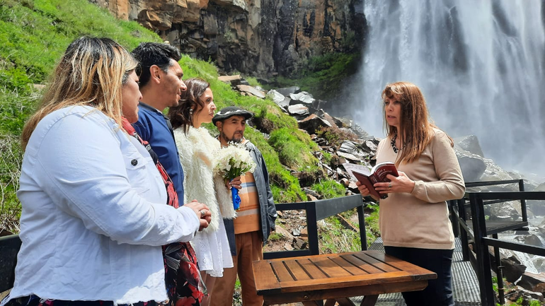 Este sábado, los novios contrajeron matrimonio al pie del icónico atractivo turístico. “Todo se dio en un ambiente de alegría, teniendo en cuenta que el día de ayer (viernes) el clima, fue de lluvia, ráfagas de mucho viento, árboles caídos y cortes de luz en toda la zona, por lo que no quedaba más que desear que como lo indicaba el pronóstico", contó la oficial público, Érica Munk, quien presidió la ceremonia.