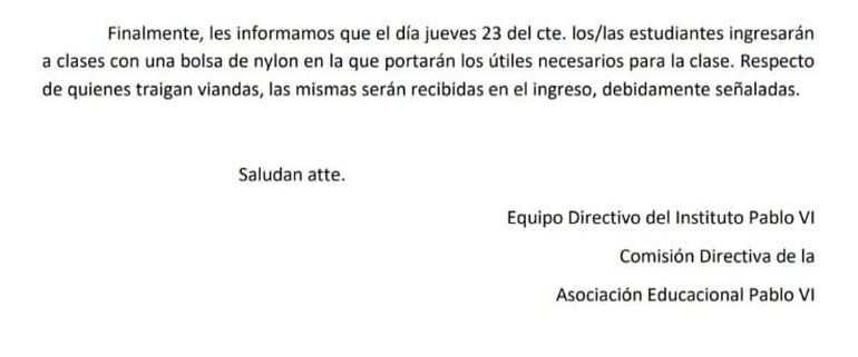 La medida fue informada a través de una comunicación oficial enviada a las familias, donde se indica que comenzará a regir desde el jueves 23. Allí se detalla que los alumnos deberán presentarse “con una bolsa de nylon en la que portarán los útiles necesarios para la clase”.