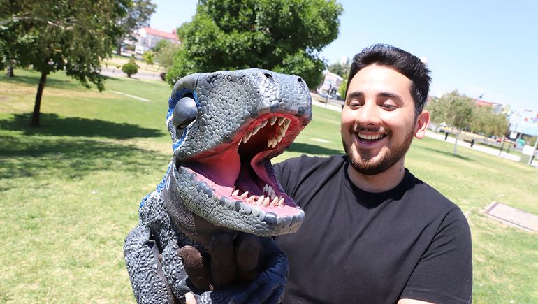 Beta es un dinosaurio animatrónico: mueve los ojos, emite sonidos, tiene expresiones y un sistema interno que permite manejarlo desde adentro. “Yo meto la mano dentro del dino y desde ahí tengo los controles. Es como un robot”, explicó Martín, que aprendió a manejarlo y darle vida en cada presentación.