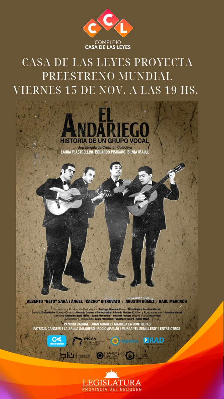 El viernes, a las 19, en avenida Olascoaga 560, se proyectará "El Andariego". De la mano del periodista Santiago Giordano vamos y volvemos en el tiempo de “El Andariego, historia de un grupo vocal”. Desde un punto de inflexión del folklore, que ellos crearon y siguieron desandando hasta el día de hoy, donde escucharlos suena tan actual.