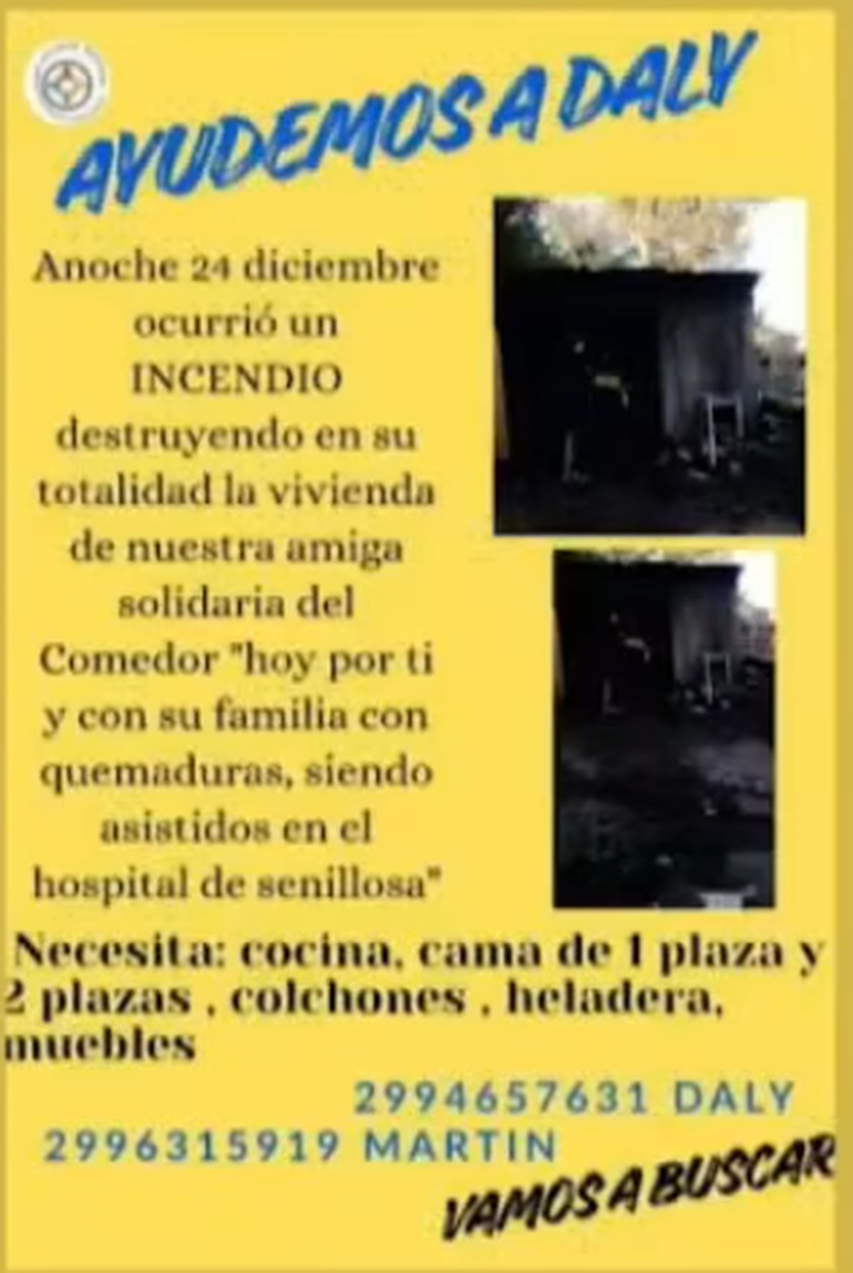 Un incendio de grandes dimensiones destruyó por completo una vivienda en la localidad de Senillosa y dejó a una familia en la calle, con pérdidas totales y personas heridas. El hecho ocurrió durante la madrugada y, según contó la damnificada, el fuego se habría iniciado por el arrojo de pirotecnia. Ante esta situación, la familia solicita ayuda solidaria para poder reconstruir su hogar y recuperar elementos esenciales.