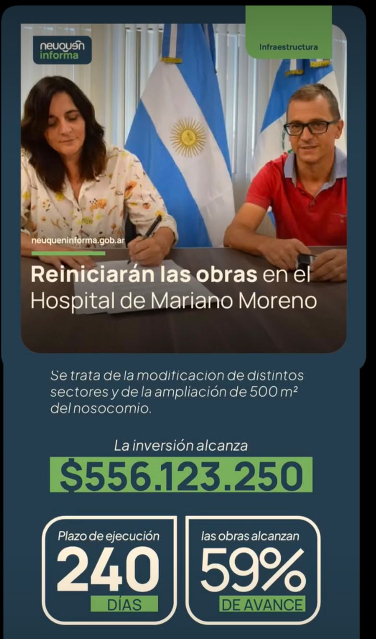 Se trata de Javier Huillipan, intendente de Mariano Moreno. A partir de este trabajo articulado entre provincia y municipio se recuperan obras emblemáticas para el pueblo como la culminación de la ampliación del hospital.