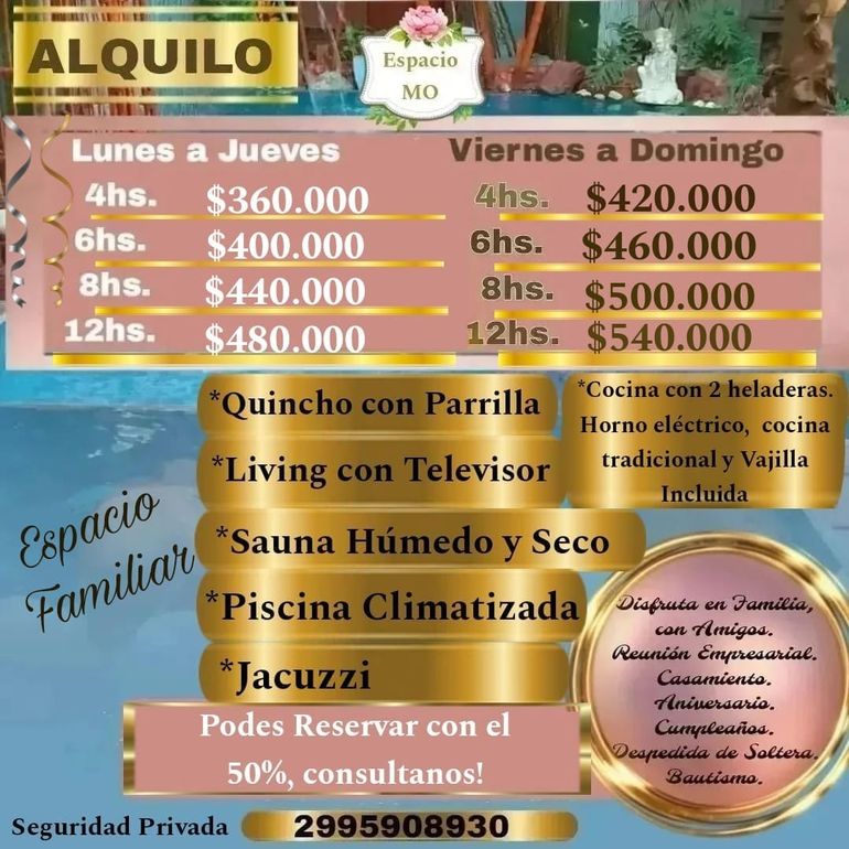 Se puede alquilar el espacio, que incluye quincho con parrilla y todos los elementos necesarios para un asado; la piscina climatizada con cascada de agua; sauna húmedo y seco; jacuzzi; una cocina con vajilla incluida; living y solárium. Se alquila por cuatro horas y hasta 12 también. La gente, por lo general, se anticipa con una reserva del 50%.