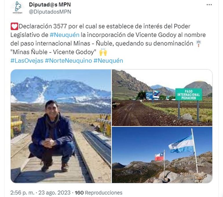La aprobación en la Legislatura fue en reconocimiento a la labor del intendente por la integración con Chile a través del Paso Minas Ñuble, distante a 50 kilómetros de Las Ovejas, que conecta al norte neuquino con la Región XVI del vecino país. Godoy fue cuatro veces intendente de esa localidad e iba por un próximo mandato.