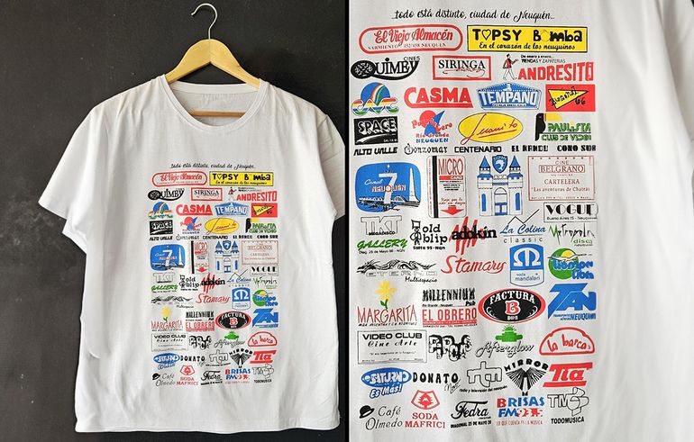 Así fue como sacando imágenes del mismo grupo de Facebook donde la remera se hizo famosa, de otro espacio similar que se llama “Neuquén del Ayer”, de algunas calcos que tenía en su casa y de la colaboración de muchos amigos que lo ayudaron a buscar en revistas viejas, juntó los 52 logos que hoy hacen que su remera sea un salto temporal de casi tres décadas.