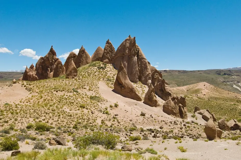 Allí comienzan las formaciones: rocas de origen volcánico, ignimbritas moldeadas por eones de viento, lluvia y heladas. Con alturas que llegan a los 15 metros, estas estructuras recuerdan agujas, conos y hasta figuras que el ojo humano quiere descifrar. Es un paisaje de tonos tierra que, según la luz, pasa del ocre al rojo y se destaca en medio de la vasta estepa patagónica.