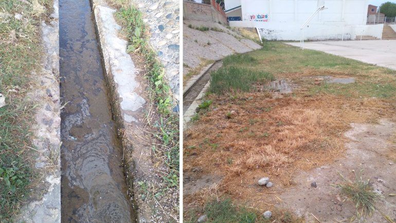El playón norte de la escuela está constantemente con agua servidas que brotan de las napas y que se van acumulando en una canaleta a cielo abierto. Además de los olores nauseabundos que emanan, la presencia de este líquido residual genera colonias de larvas y mosquitos que pican a los alumnos y a sus docentes.