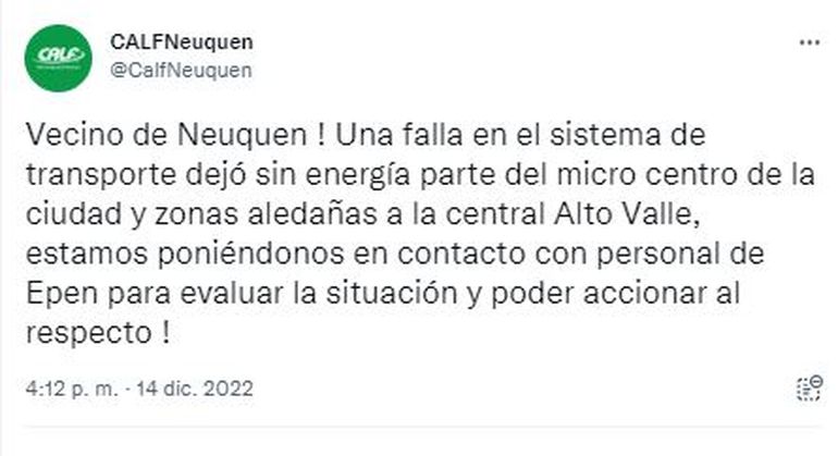 Desde la cooperativa Calf indicaron que "una falla en el sistema de transporte dejó sin energía parte del microcentro de la ciudad y zonas aledañas a la central Alto Valle". Agregaron que "estamos poniéndonos en contacto con personal de Epen para evaluar la situación y poder accionar al respecto".