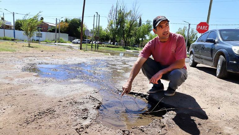 A metros de esa esquina se ve cómo brota el agua desde un caño en la calle Houssay y cae directo hacia Ignacio Rivas. "Hace cerca de dos años, cuando hicieron el asfalto, no terminaron la obra de desagüe, entonces toda el agua se queda de esquina a esquina generando una laguna que con los días se empieza a convertir en marrón porque se mezcla con desperdicios", explicaron los vecinos a LMNeuquén.