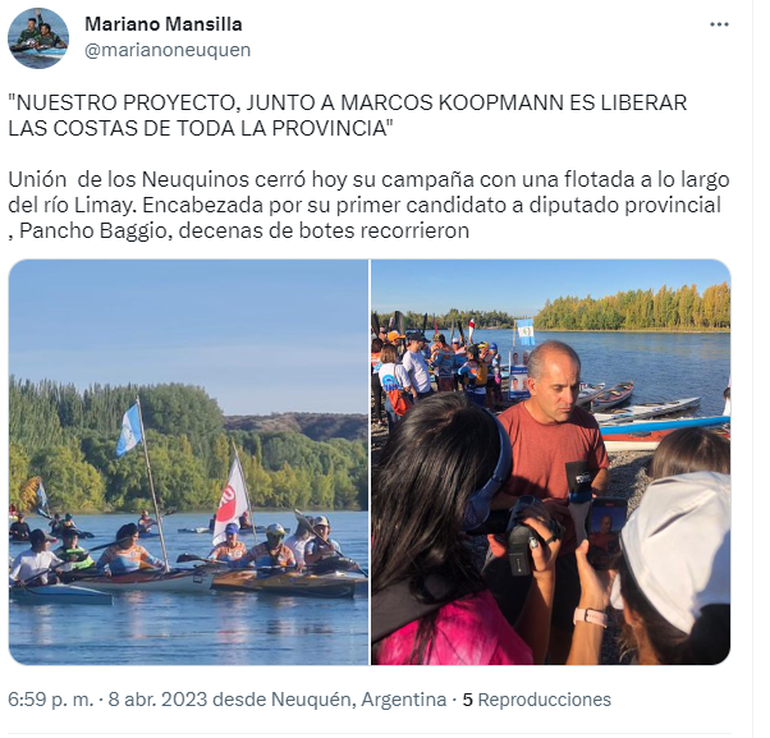 Unión de los Neuquinos cerró este sábado su campaña con una flotada a lo largo del río Limay. La actividad estuvo encabezada por el primer candidato a diputado provincial, Francisco 'Pancho' Baggio, que fue acompañado por decenas de botes que recorrieron el cauce desde Valentina Sur hasta el Paseo de la Costa. A la flotada se sumó también la nadadora de aguas frías, Verónica Casano.