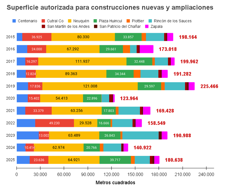 La ciudad de Neuquén fue protagonista central, aportando 63.489 metros cuadrados en ese período, consolidando su liderazgo absoluto. Sin embargo, la llegada de 2024 trajo consigo un cambio de escenario radical. A nivel provincial, la superficie autorizada se desplomó un 25,32%, hasta los 140.922 metros cuadrados, reflejando el impacto de la paralización de la obra pública y la recesión económica nacional.