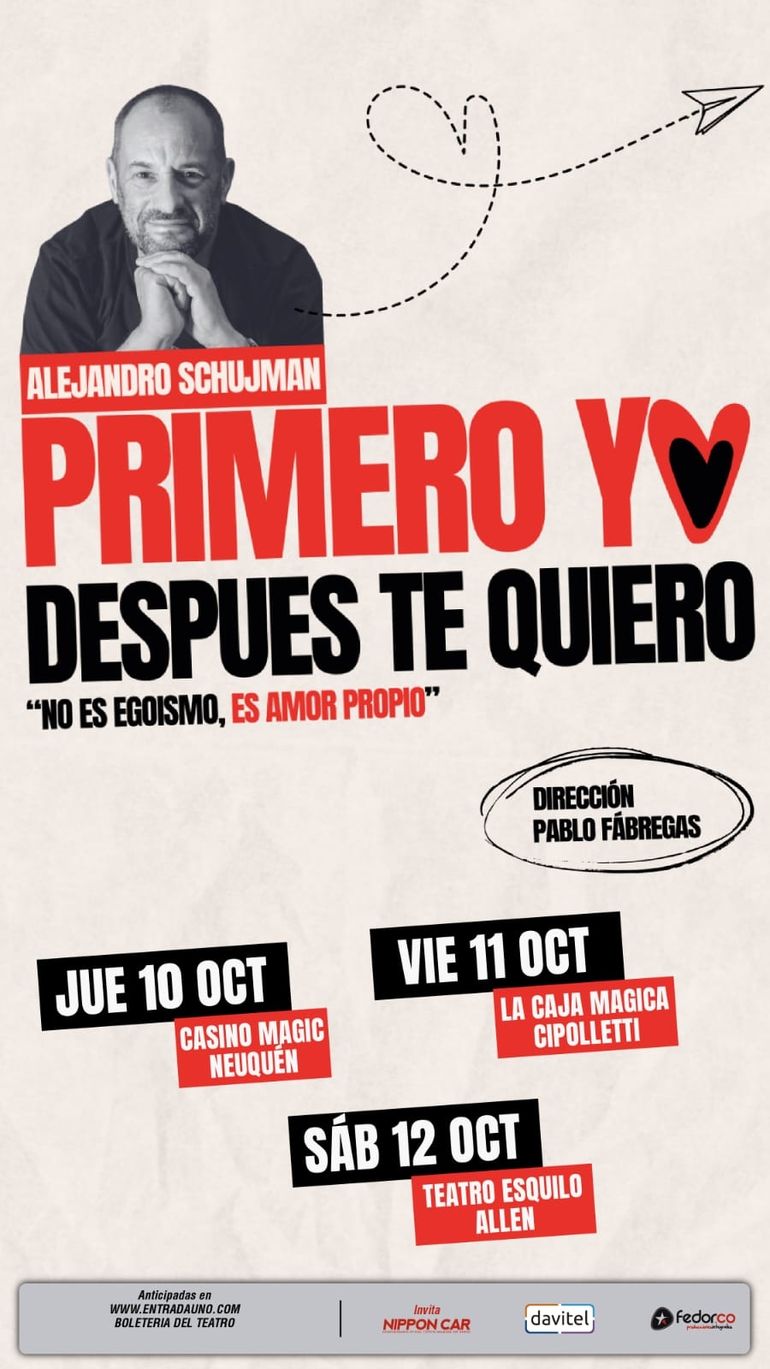 “Primero yo, después te quiero”, se presenta el jueves, a las 21, en el Casino Magic. El viernes 11, a las 21, estará en La Caja Mágica, Cipolletti. Mientras que el sábado 12, a las 21 cerrará su paso por el Alto Valle en el Teatro Esquilo de Allen. Las entradas pueden conseguirse anticipadas en las boleterías de los teatros y por entradauno.com.