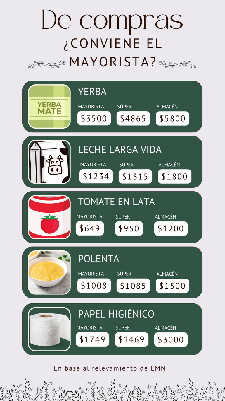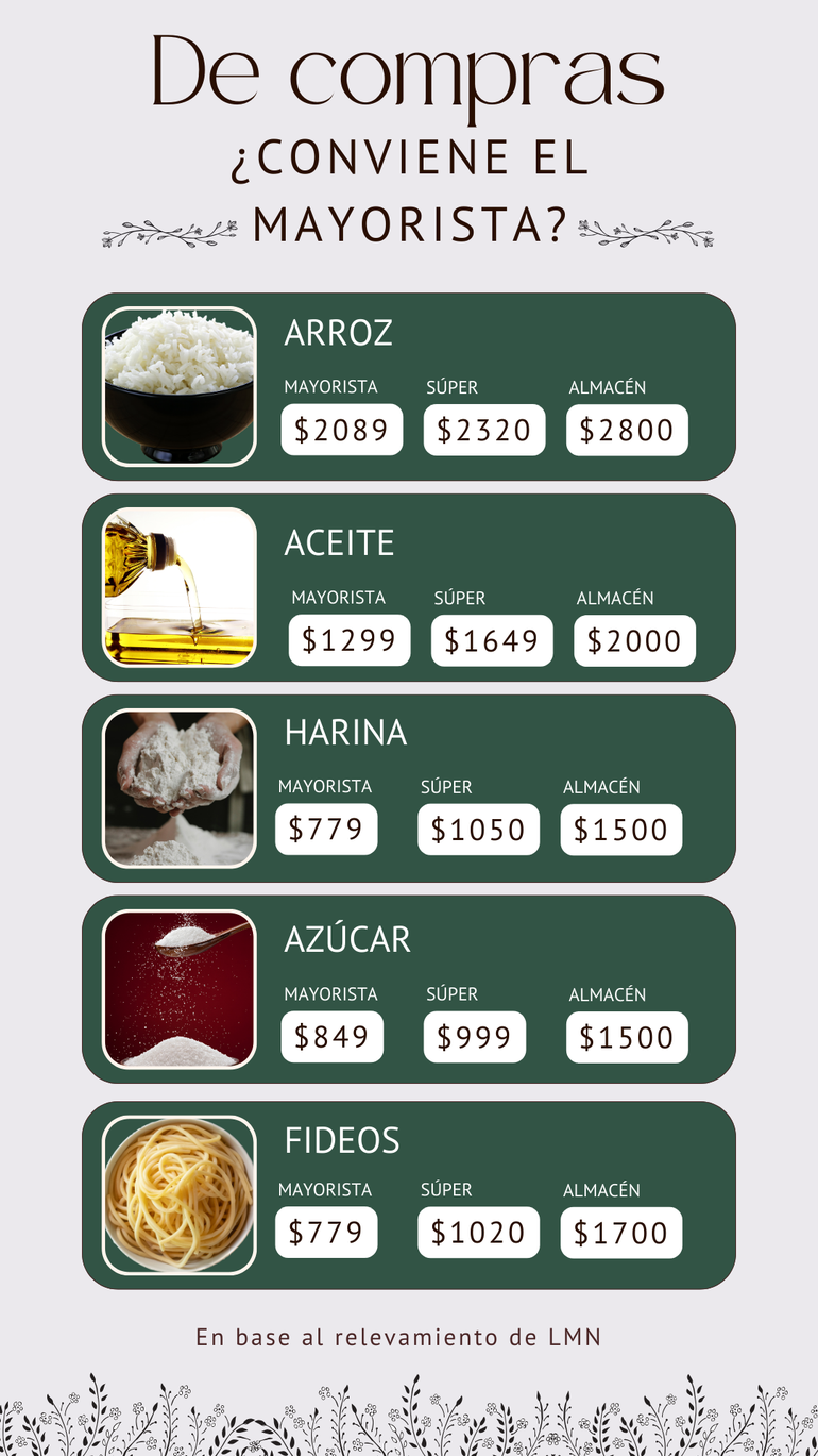 La visita que hizo este diario fue al mayorista Vital. Los precios que se van a exhibir se obtienen comparando tres productos iguales. Varios alimentos de la marca propia de este mayorista tenían precios muy por debajo de otras marcas. Por otra parte, en los supermercados muchas veces hay ofertas de algunos productos que hasta pueden ser mejores o iguales que los mayoristas. En tanto, en los almacenes barriales los precios son superiores, pero con la facilidad de la cercanía y también suelen tener ofertas.