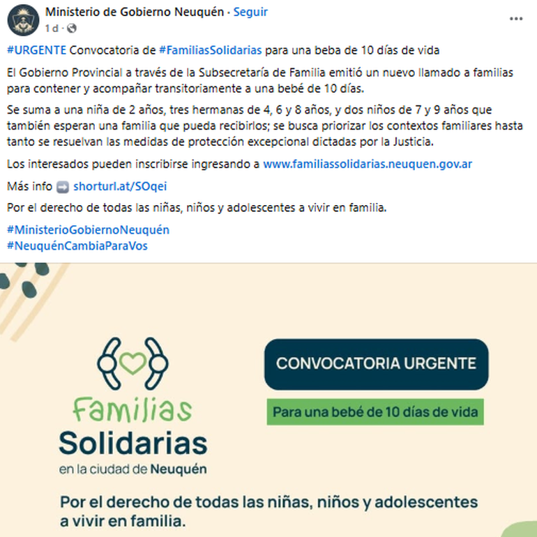 Desde el organismo explican que se trata de una medida excepcional ordenada por la Justicia y solicitada por la Defensoría del Niño, ante una situación que impide que la niña permanezca con su familia de origen. En esos casos, se activa la búsqueda de una familia solidaria que pueda cuidar temporalmente al menor.