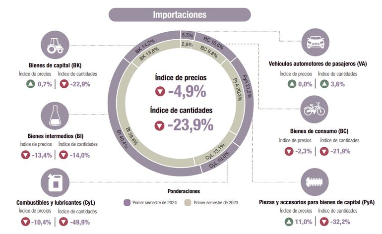 Para las importaciones mensuales, los índices de precios cayeron 7,9% en abril, 4,3% en mayo y 1,7% en junio, mientras que las cantidades registraron en esos meses una variación negativa de 16,3%, 29,3% y 34,5% respectivamente.