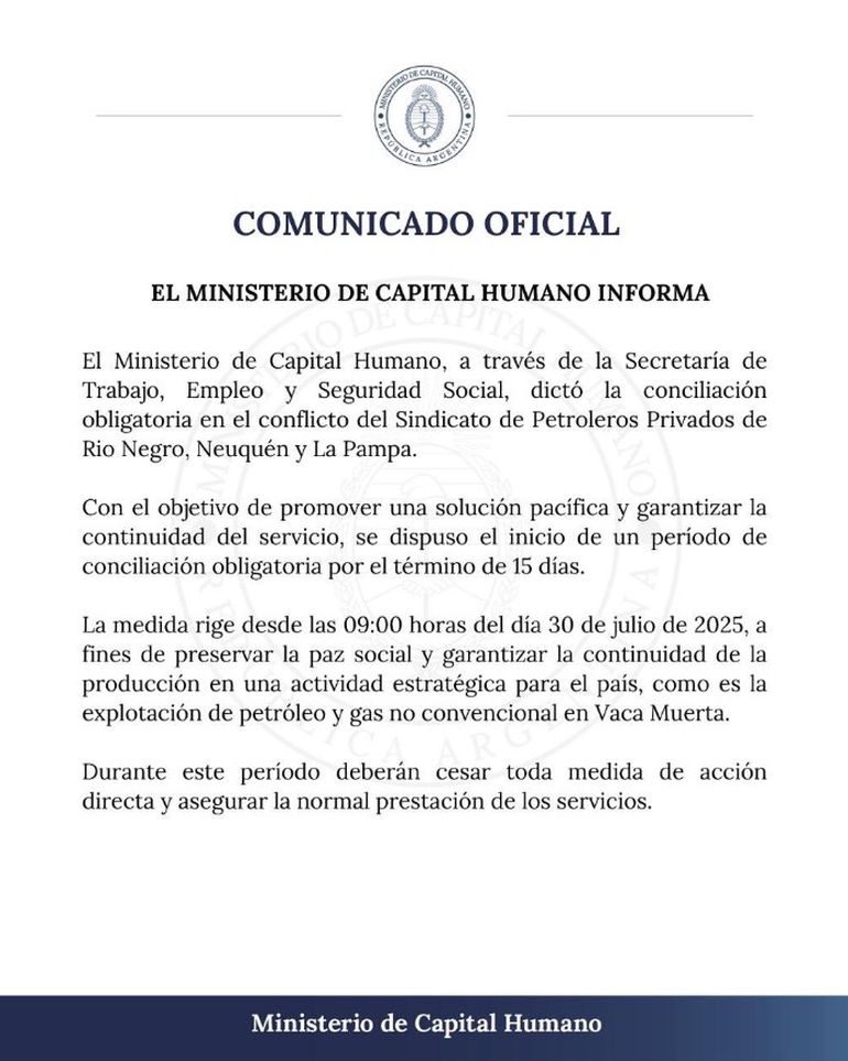 La medida rige desde las 9 de este miércoles 30 de julio del 2025, "a fines de preservar la paz social y garantizar la continuidad de la producción en una actividad estratégica para el país, como es la explotación de petróleo y gas no convencional en Vaca Muerta", precisa el comunicado publicado en los canales oficiales del Gobierno.