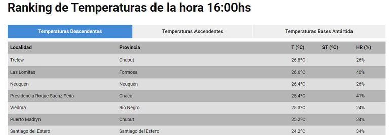 El Servicio Meteorológico Nacional (SMN) elaboró un ránking de las ciudades más calurosas del país. El primer lugar lo ocupa Neuquén y el segundo Trelew, en Chubut. Le sigue Las Lomitas, en Formosa, con 26.4 grados centígrados y San Antonio Oeste, en Río Negro, con 25.5 grados.
