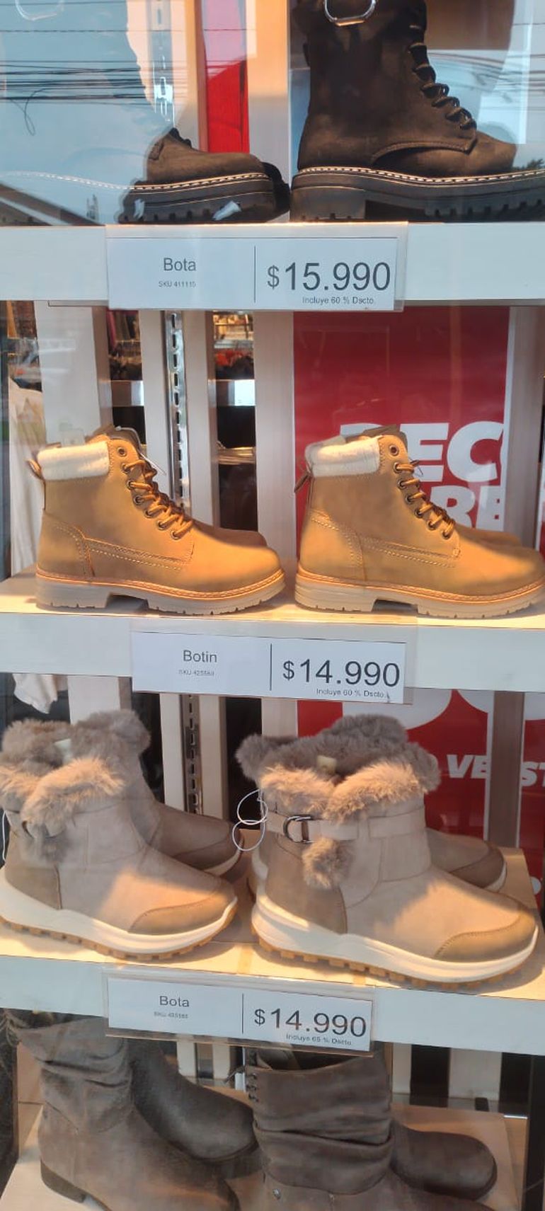 El calzado para adultos de las marcas más reconocidas está por encima de los 50.000 pesos chilenos, con modelos que llegan a los 85.000 pesos chilenos para el calzado deportivo. En este rubro hay mucha amplitud porque también hay ofertas de calzado importando, de muy buena calidad y a precios que en los estantes con ofertas rondan entre los 17.000 y 20.000 pesos chilenos.