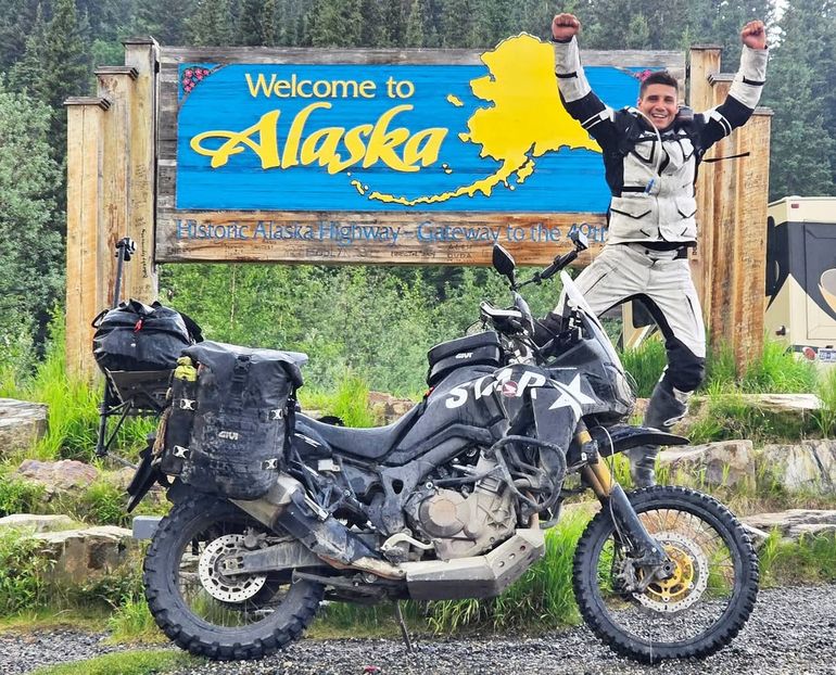 En las imágenes, grabadas a la vera de la icónica Ruta Dalton, se lo ve visiblemente emocionado mientras se detenía frente al cartel que indica la entrada a Alaska. El día nublado y lluvioso que no impidieron la celebración. A sus espaldas, su inseparable moto cargada con alforjas y una bandera argentina.