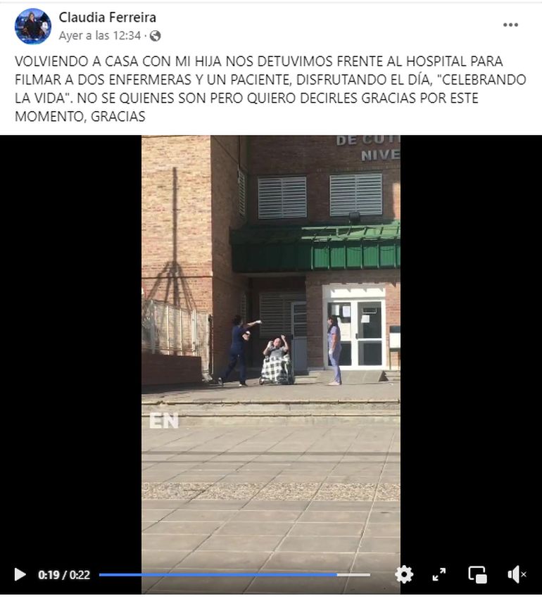 “No sé quiénes son, pero quiero decirles gracias por este momento. Gracias”, posteó la mujer junto al video que cosechó cientos de reacciones y fue compartido por vecinos de toda la región. En tanto, su hija aseguró que: “Ver su sonrisa y escucharlo hablar sobre lo feliz que estaba por salir un rato a tomar sol fue de las cosas más linda. Agradecida con esas hermosas personas que le devuelven la vida y la alegría a cada paciente”.
