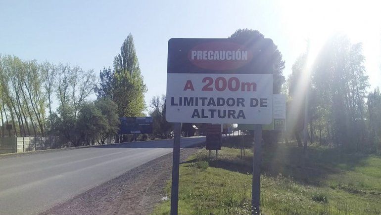 La cartelería de Vialidad Provincial tanto de la prohibición de camiones de gran porte como de la limitación de altura (2,9 metros) está ubicada a pocos metros del dique y debería estar un poco más retirada para que los camioneros puedan maniobrar antes de que sea tarde.