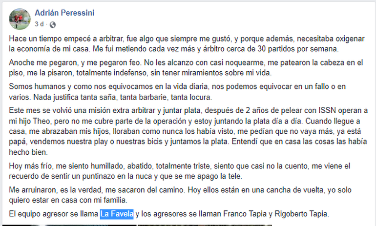 “Este mes se volvió una misión extra, arbitrar y juntar plata, después de dos años de pelear con ISSN operan a mi hijo Theo, pero no me cubre parte de la operación y estoy juntando la plata día a día. Cuando llegué a casa, me abrazaban mis hijos, lloraban como nunca los había visto, me pedían que no vaya más, ya está papá, vendemos nuestra Play o nuestras bicis y juntamos la plata. Entendí que en casa las cosas las había hecho bien”, dijo el árbitro, en un posteo que tuvo repercusión y generó el repudio generalizado.