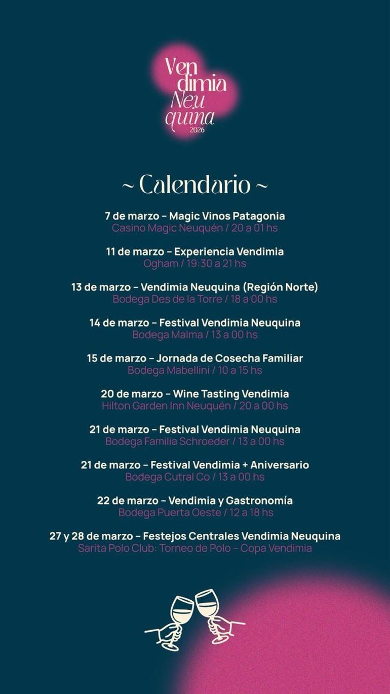 El 21 de marzo, dos bodegas celebrarán festivales de Vendimia en simultáneo: Bodega Familia Schroeder de San Patricio del Chañar, con música en vivo y degustaciones, y Bodega Cutral Co de la ciudad homónima, que sumará a los festejos el aniversario de la bodega con actividades especiales.
