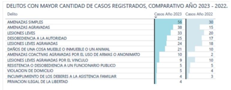Por otro lado, se advierte que mujeres que fueron denunciantes y víctimas de estos delitos incrementaron el nivel de denuncias con respecto al mismo período del 2022. Si en 2022 se realizaron 30 denuncias por amenazas simples este año ascendieron a 56. Las referidas a amenazas agravadas saltaron de 15 a 38, por lesiones leves se incrementaron de 20 a 33 y por lesiones agravadas ascendieron de 18 a 24.