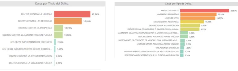 Los delitos más denunciados en esta fiscalía, corresponden a los delitos contra la libertad y contra las personas. En cuanto al tipo de delito, encabeza el listado las amenazas simple (20,18%), seguida de amenazas agravadas (15,45%), lesiones leves (14,91%) y lesiones leves agravadas (10,03%) en cuarto lugar.