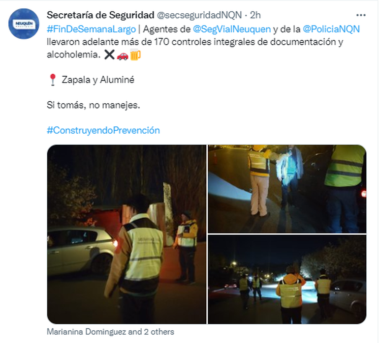 Con motivo de la finalización del fin de semana extra largo, durante este lunes se realizaron controles en las zonas de Aluminé, Zapala y Piedra del Águila por el regreso de las familias que viajaron a distintas localidades turísticas de la provincia. La policía de la provincia de Neuquén, Gendarmería Seguridad Vial tanto de la Provincia como de Nación, se encuentran trabajando en distintos puestos de control. También realizaron controles de alcoholemia.