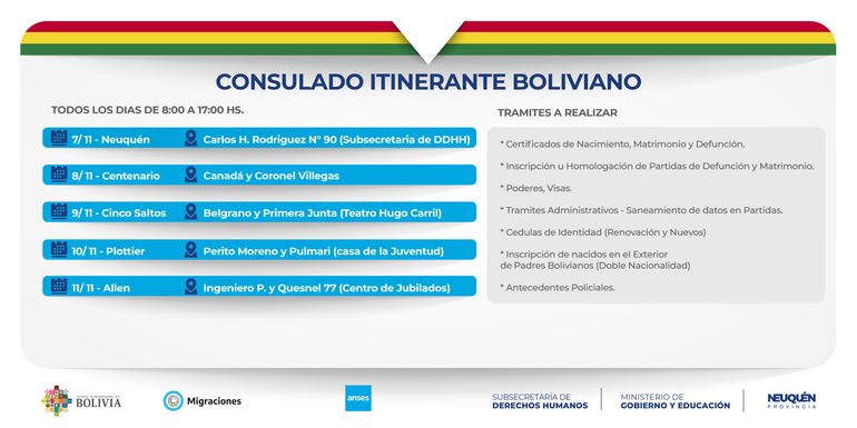 El consulado boliviano itinerante llega al Alto valle el próximo 7 de noviembre. Recorrerá Neuquén, Plottier y Centenario de hasta el 11. También pasará por otras localidades de Río Negro como Neuquén, Cinco Saltos y Allen.
