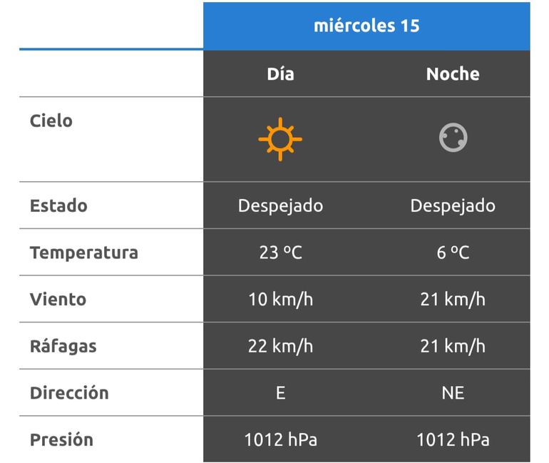 Según el pronóstico de la Autoridad Interjurisdiccional de Cuencas (AIC), en la ciudad de Neuquén la máxima alcanzará los 23 grados, con cielo completamente despejado durante el día y la noche. El viento será leve, del sector este, con ráfagas que apenas rondarán los 23 kilómetros por hora.